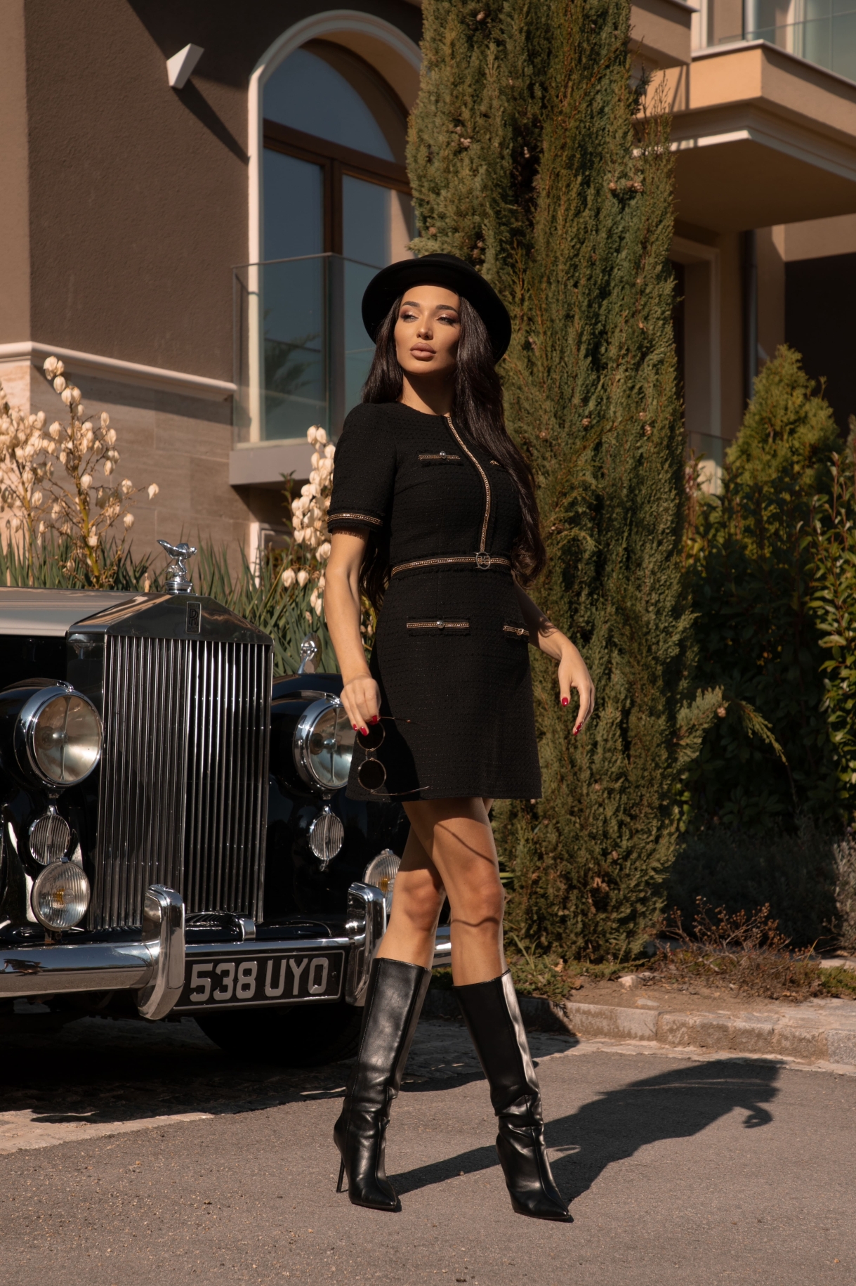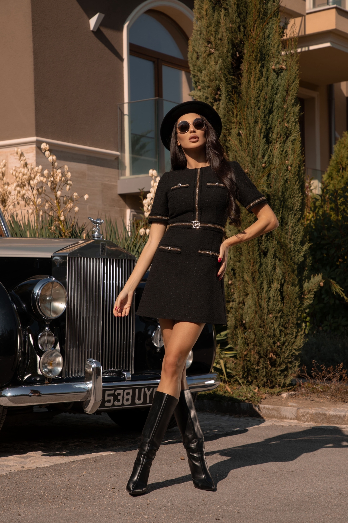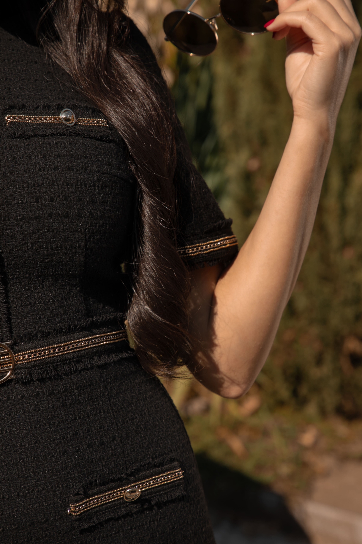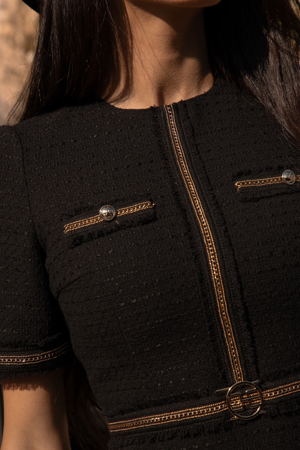 Къса рокля в черно, изработена от плътно и нежно букле. Моделът е с 3/4 ръкави, обло деколте и втален трапецовиден силует. Роклята е декорирана на ръкавите и предната част с ефектни ленти с разнищен ефект, златиста верижка и колан със златиста тока с лого CHRISTINE. Закопчаване в задната част със скрит цип "YKK".