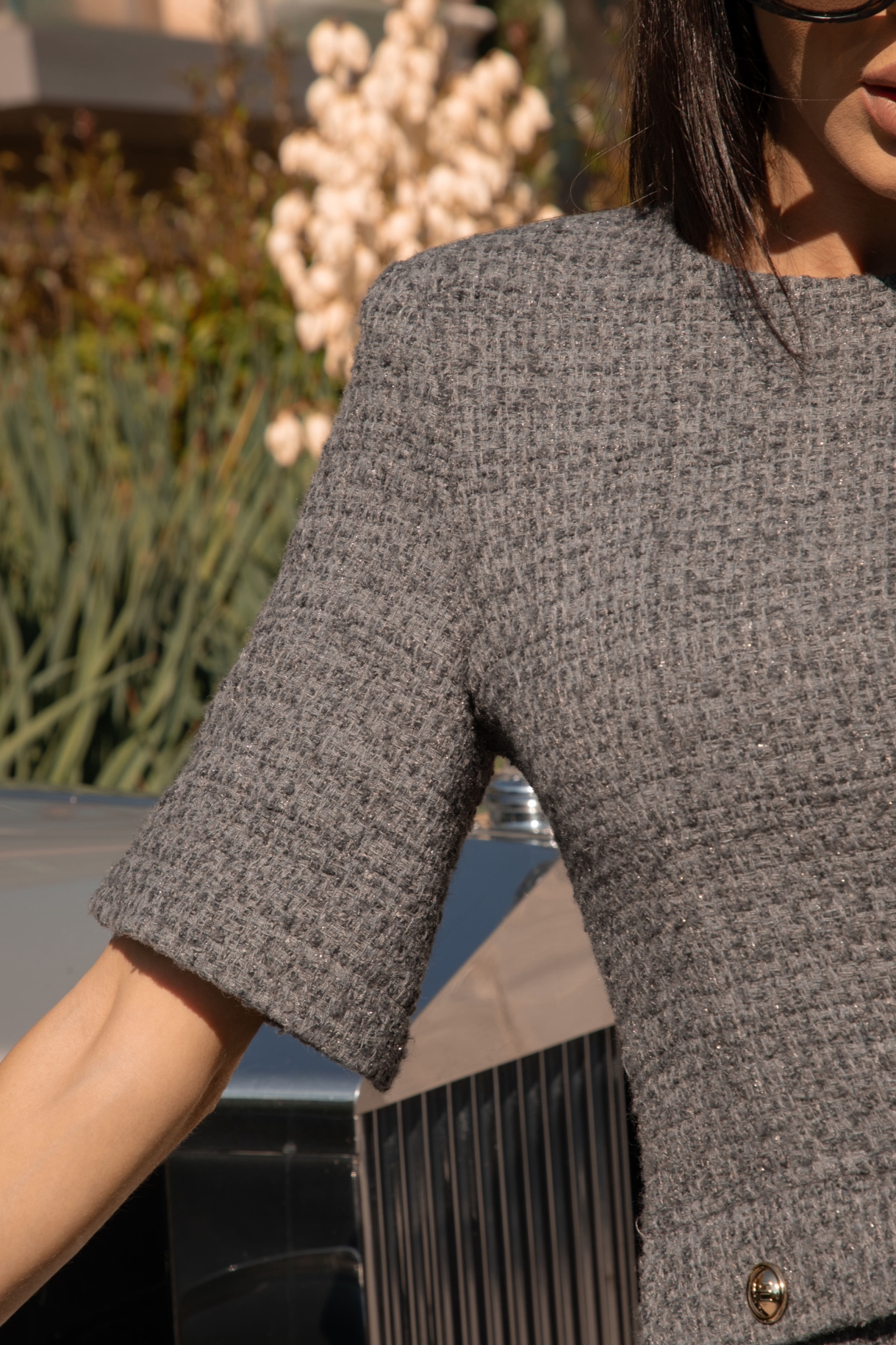 Рокля в сиво с трапецовидна форма и 3/4 ръкав, изработена от италианско букле с фина бляскава нишка, изцяло подплатена с луксозен брандиран хастар. Моделът е външни джобове и капаци с метални златисти копчета с лого. Закопчаване в задната част със скрит цип "YKK".