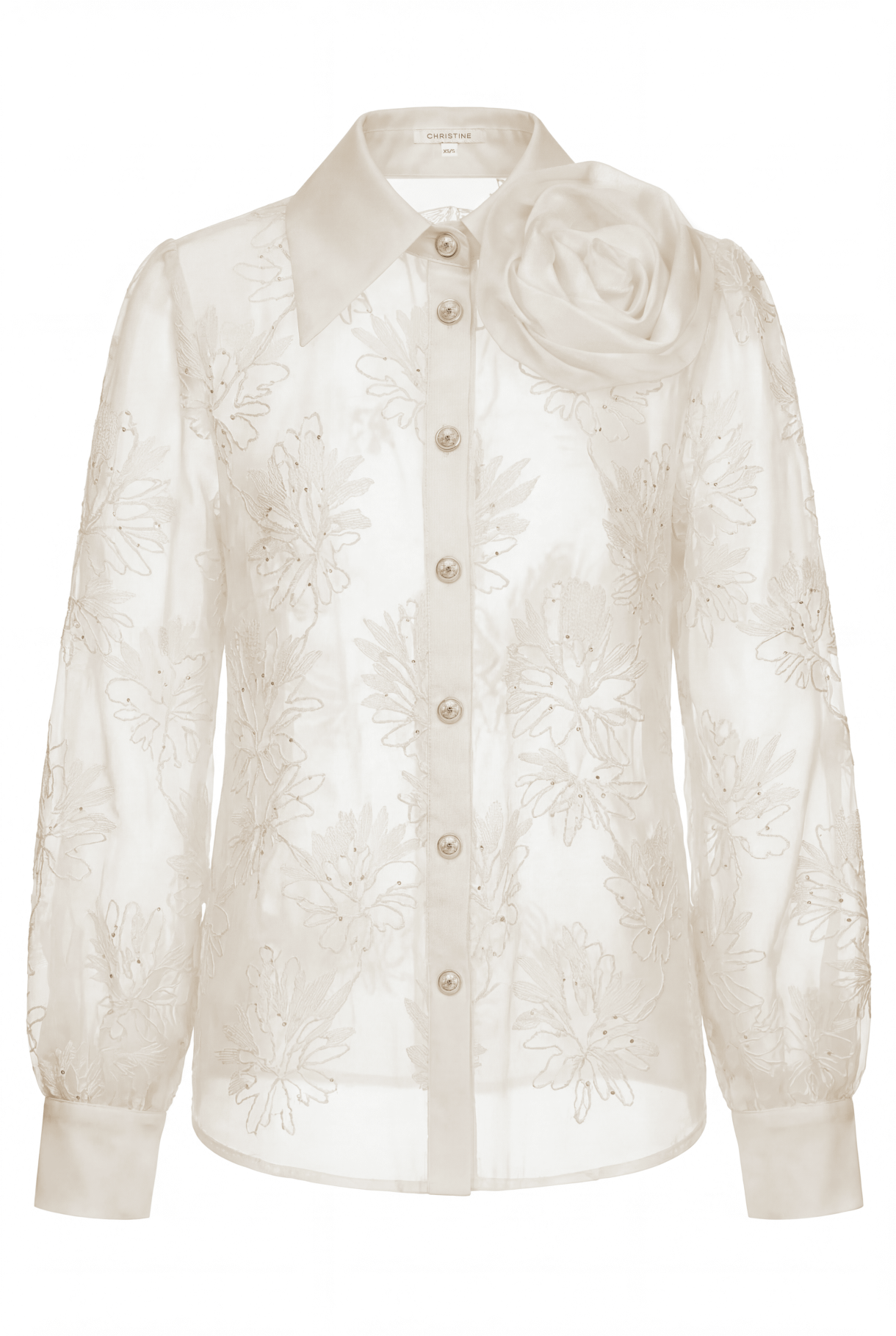Луксозна дамска риза, изработена от разкошна естествена материя с бродерия на цветя - лиосел. Моделът е с дълги красиви ръкави, яка, свободен силует и закопчване в предната част с метални златисти копчета с лого CHRISTINE. Моделът е декориран с ръчно изработена брошка от основния плат.