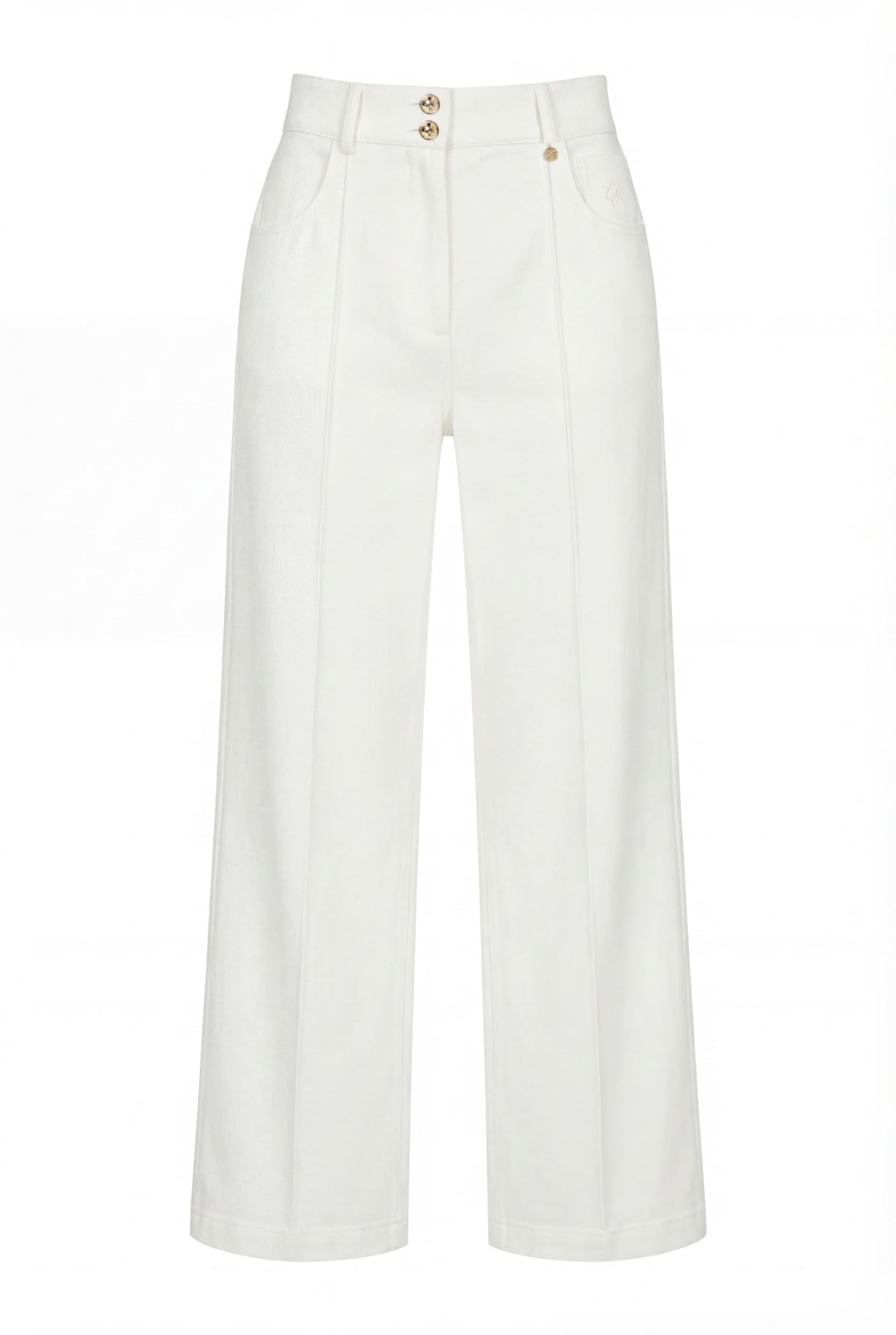 Широк дълъг панталон в бяло с висока талия, изработен от дънкова памучна материя. Моделът е с ръб с машинен бод, джобове в предната и задната част, закопчаване с цип "YKK" и метална златиста висулка и копчета с лого. Панталонът е с допълнително малко джобче в предната част с бродерия CHRISTINE.