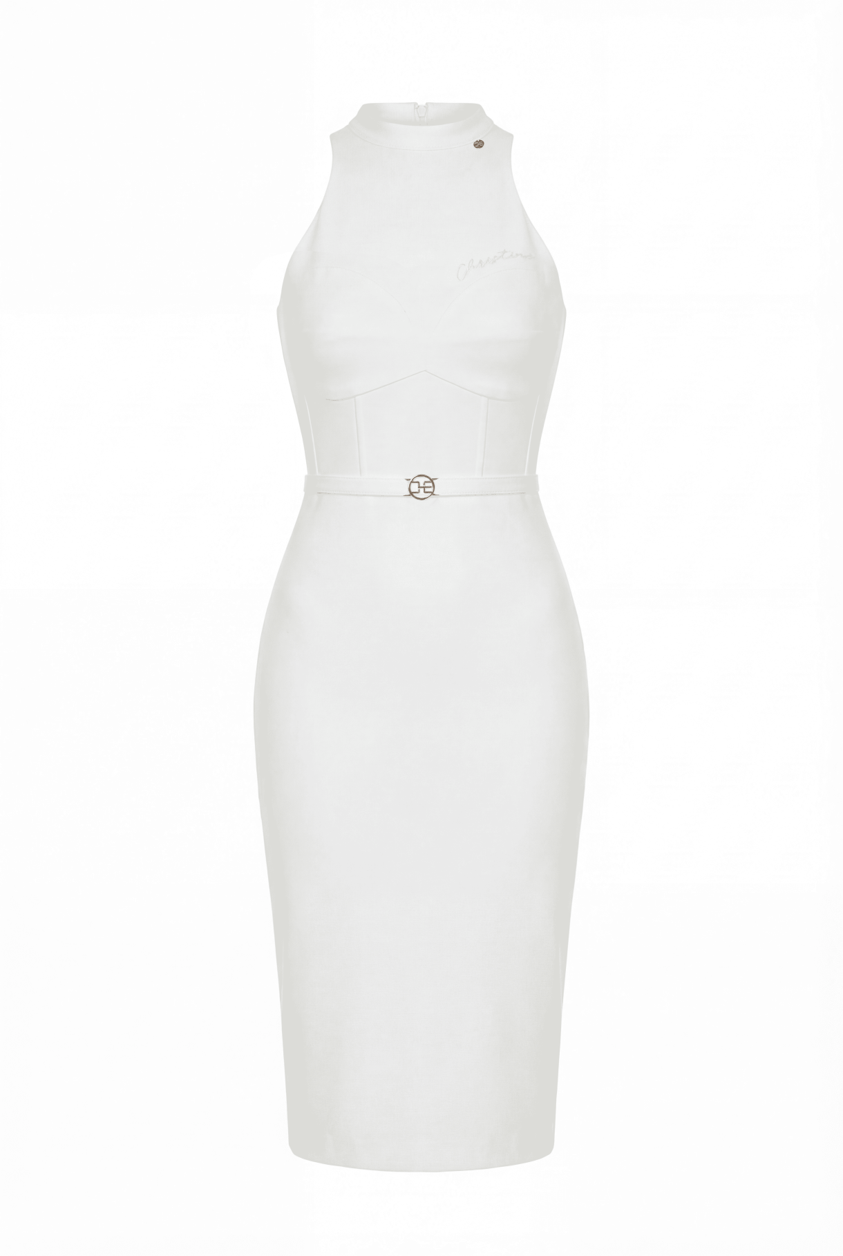 Рокля в бяло, изработена от плътна и нежна италианска материя с еластичност. Роклята е със силует следващ извивките на тялото с ефектно деколте тип бюстие с чашки, яка и шлиц в задната част. Моделът е декориран с бродерия CHRISTINE на деколтето, метална висулка с лого и колан изработен от основната материя с метална златиста тока с лого CHRISTINE.