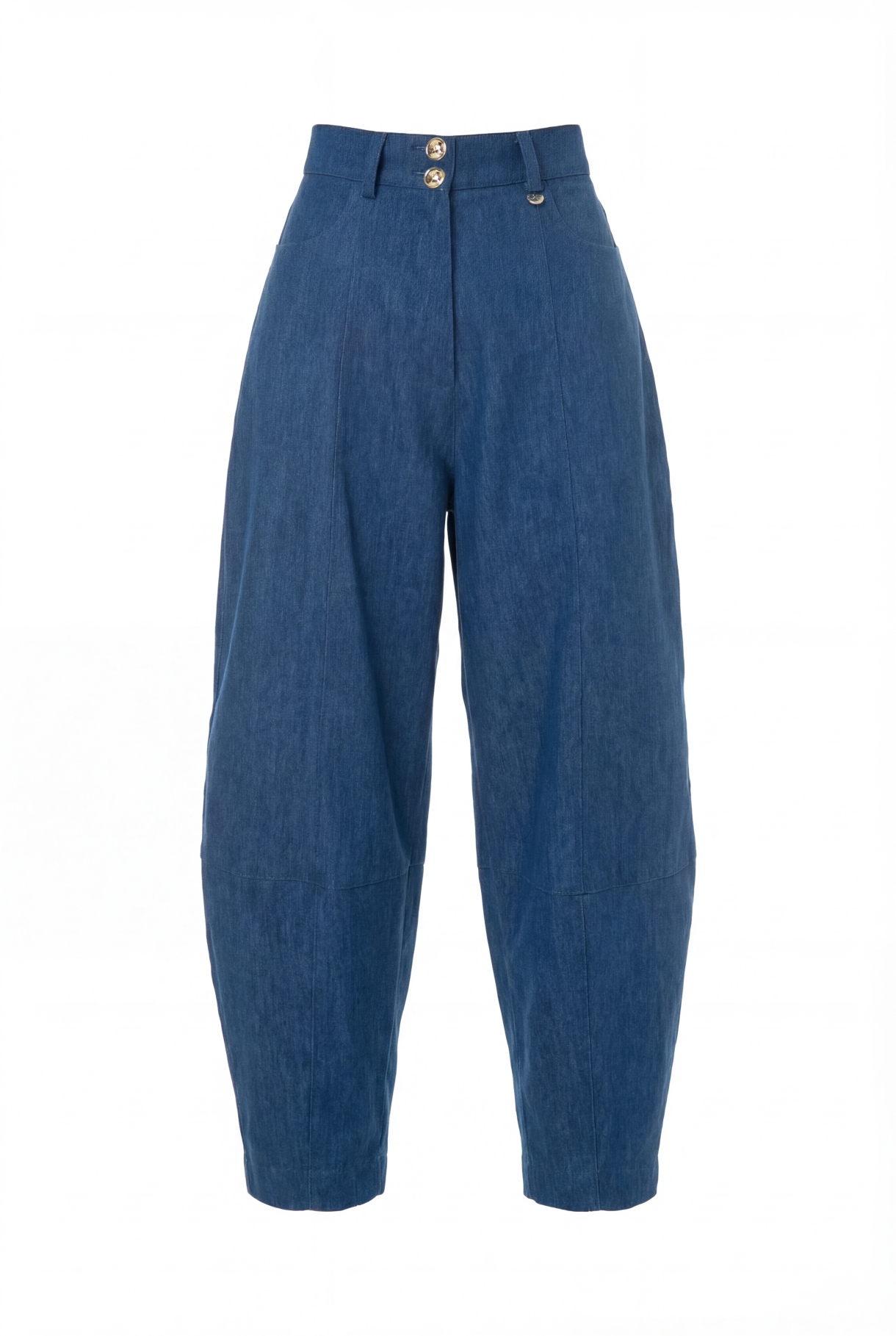 Широк дълъг панталон в тъмносиньо с висока талия, изработен от дънкова памучна материя. Моделът е с ефектни крачоли, джобове в предната и задната част, закопчаване с цип "YKK" и метална златиста висулка и копчета с лого.
