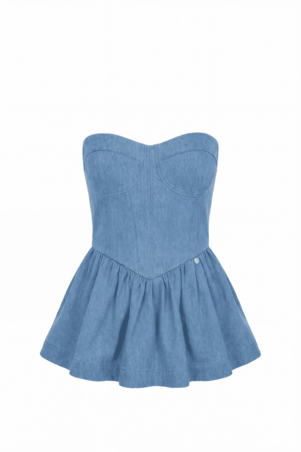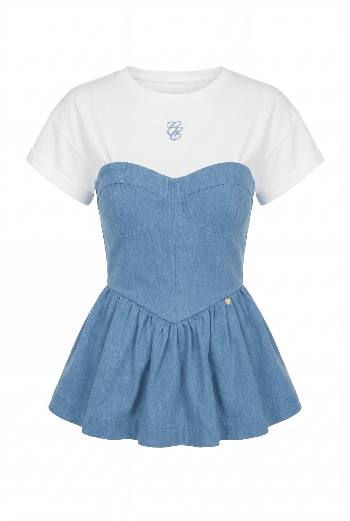 Къс топ в светлосиньо, изработен от дънкова памучна материя. Моделът е с бюстие с чашки и ефектна линия следваща извивките на талията, декориран с метална златиста висулка с лого CHRISTINE. Топът е със закопчаване в задната част със скрит "YKK" цип.