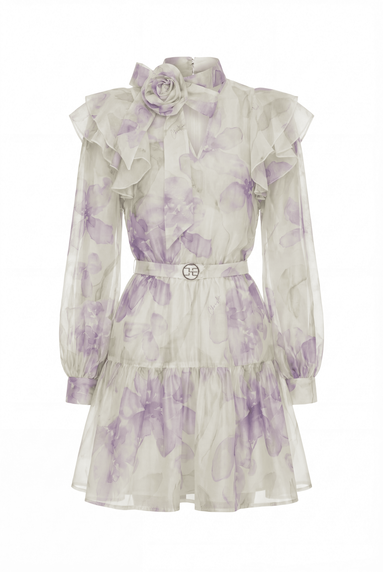 Дамска рокля, изработена от финa, лекa и нежна естествена материя - лиосел. Материята е със собствен принт CHRISTINE. Моделът е с дълги ръкави, ефектни къдри на раменете, V-образно деколте с яка и завръзване на пандела. Роклята е декорирана с ефектно ръчно изработено цвете от основния плат. Моделът е с богато разкроена долна част в набор с волан с фин хастар. Роклята е с колан от основния плат с метална златиста тока с лого CHRISTINE. Закопчаване на маншетите с метални златисти копчета с лого.