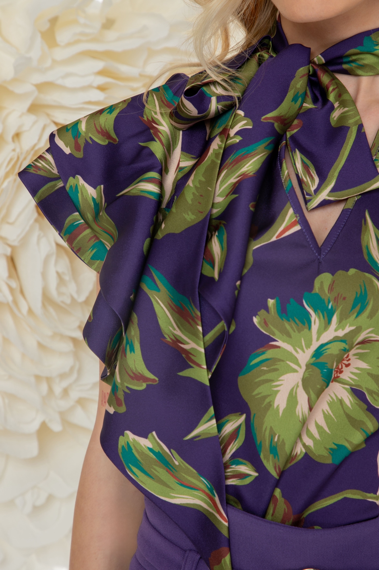 Луксозен дамски топ, изработен от лека и нежна сатенирана материя в лилаво и зелено. Моделът е с ефектни двойни къдри, V-образно деколте с яка и завръзване на пандела.